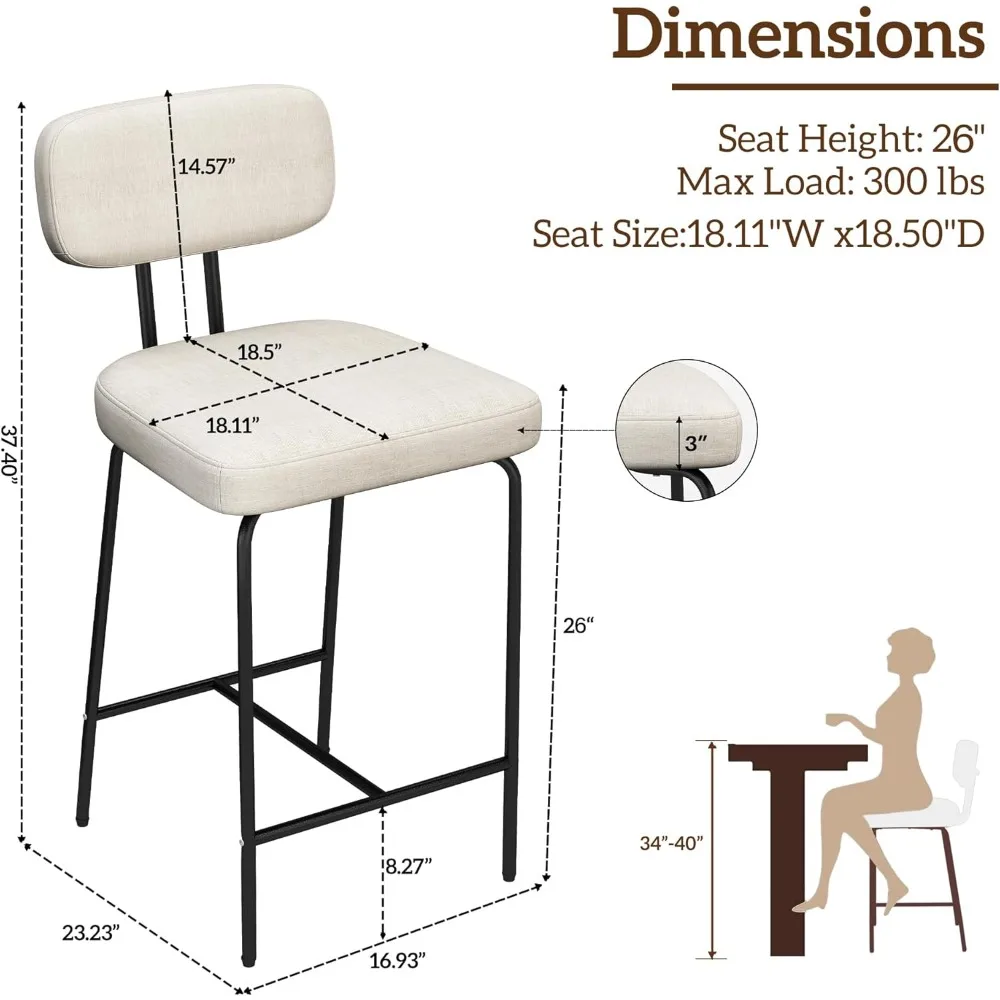 Comfortable Barstools: Ergonomically designed seat for optimal comfort, offering back support and a footrest for leg relaxation; The kitchen island stools is made of high-quality linen fabric that resists fading; the soft cushioned seat is filled with high-density foam, which provides ample comfort for extended sitting