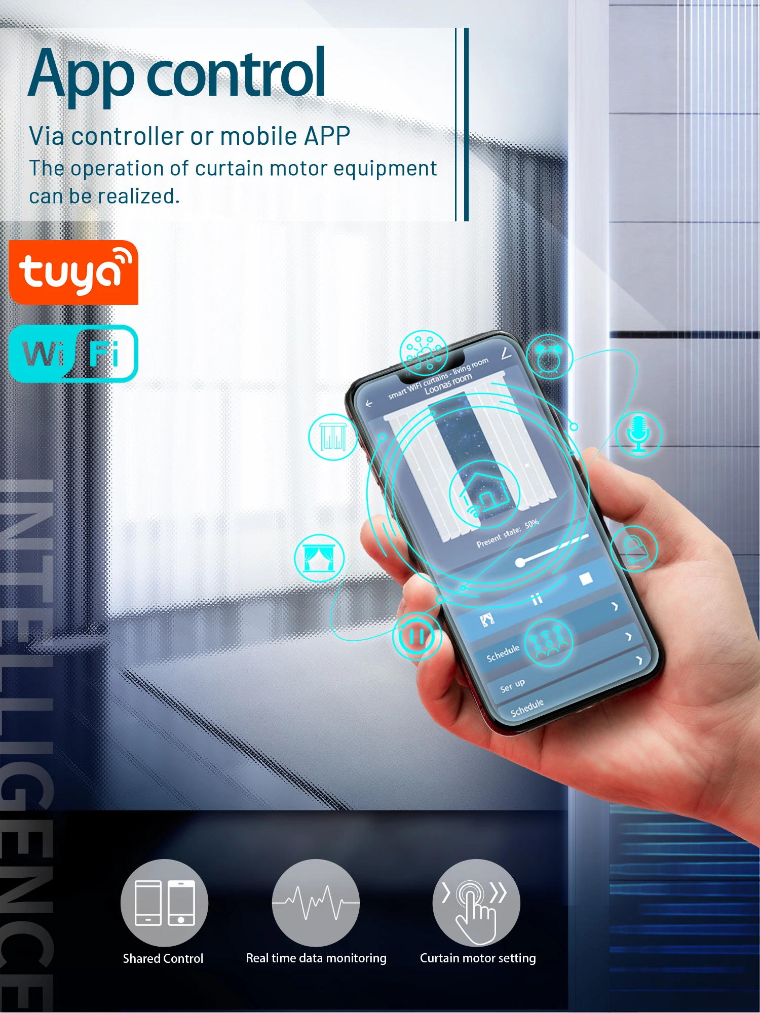 The curtain status is visible, Real-time status showed on App.