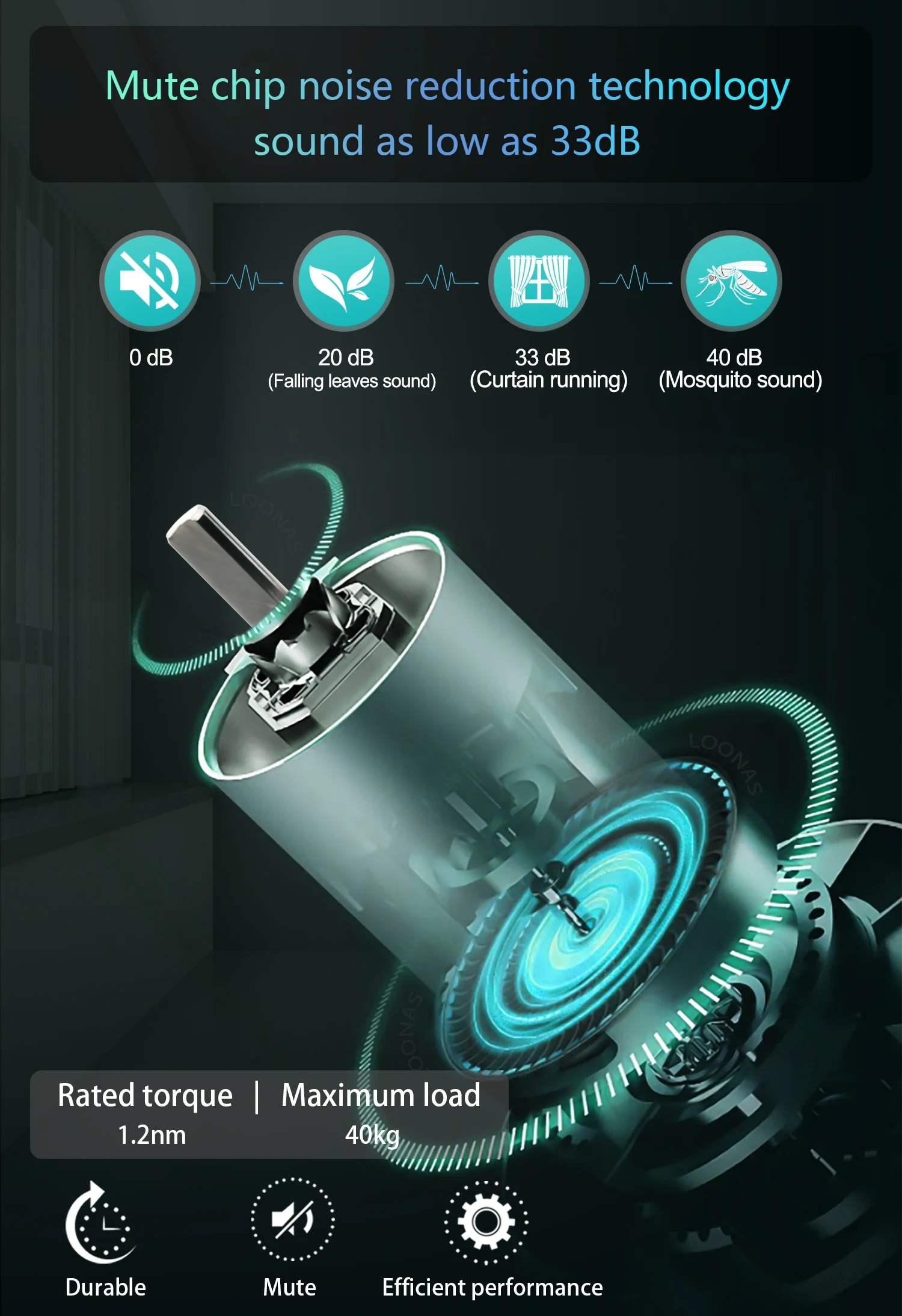 Ultra-quiet (<33dB) you will hardly feel any sound during the motor running process, while providing 1.2nm rated torque and 40kg maximum load
