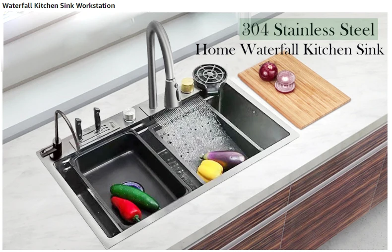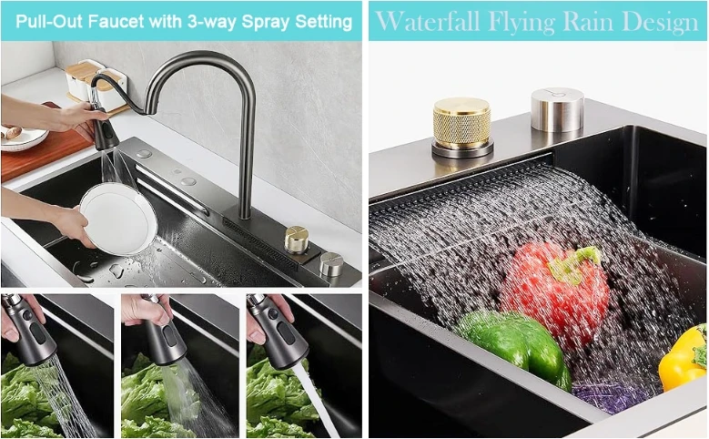 The sink features a Flying Rainfall waterfall design, honeycomb embossing on the bottom of the sink, and X-shaped quick drain.