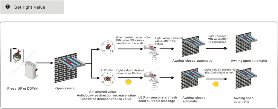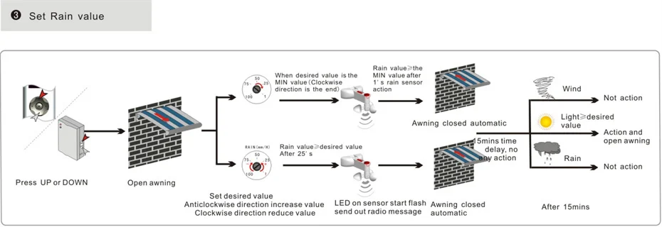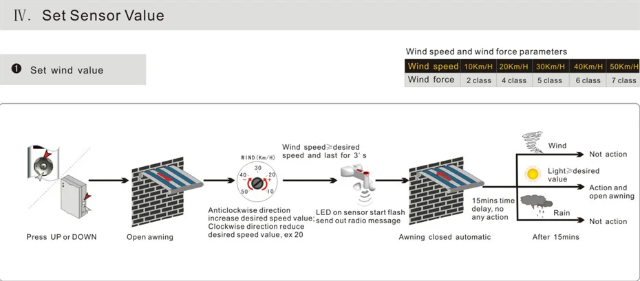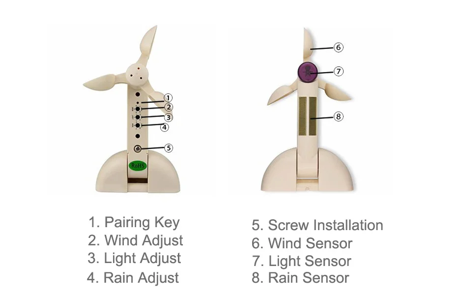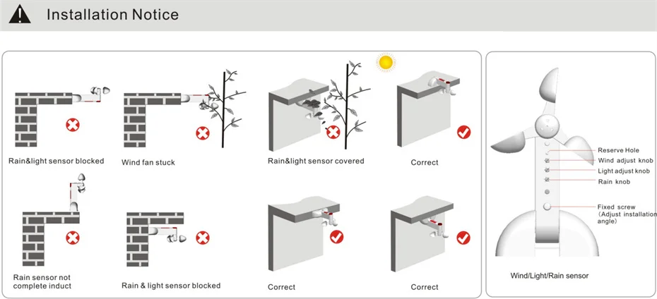 5. After installation, you need to set wind value, light value and rain value according to suggestions on the manual and adjust them