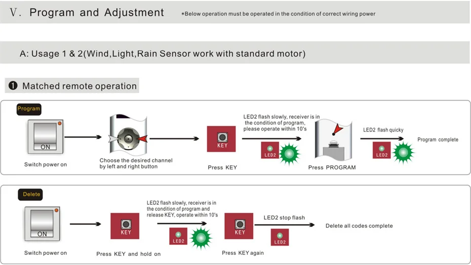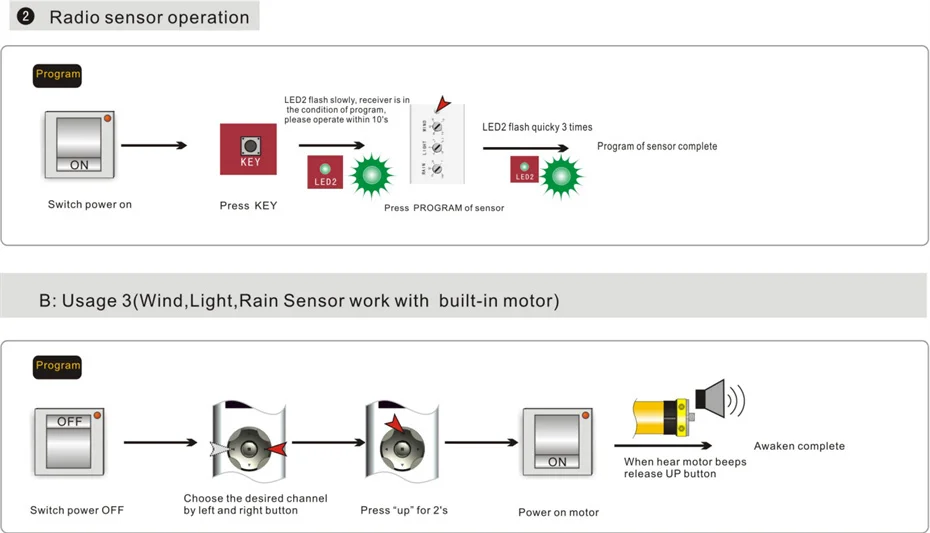 1. This RF433 wind light rain sesnor only work with Dooya RF433 motor of fixed code(motor made by Dooya before 2025)