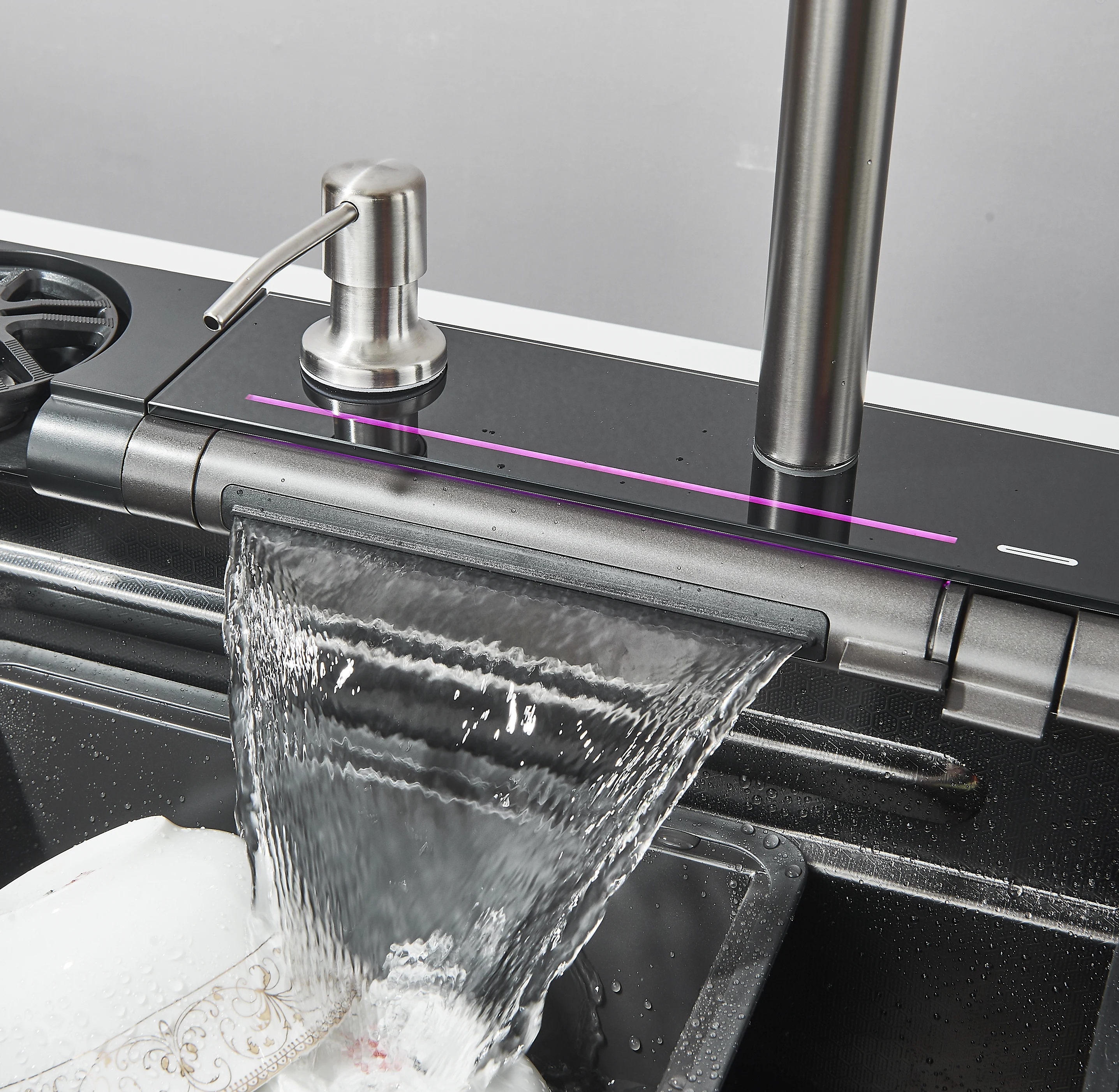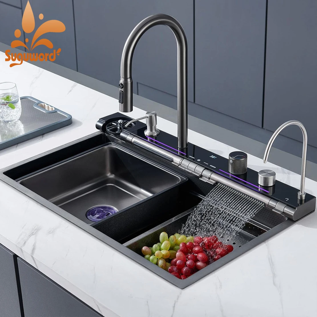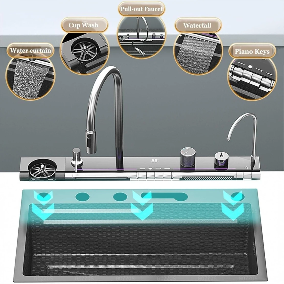 Stainless Steel Kitchen Waterfall Sink Digital Display Large Single Sink Dish Basin Sink Purification water Cup Washer Crane