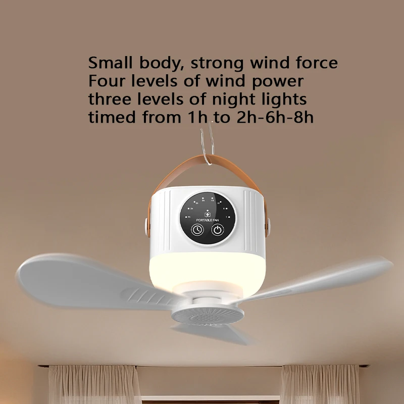USB dormitory/camping small ceiling fan 8-hour timer, with night light, 4 levels of strength portable fan